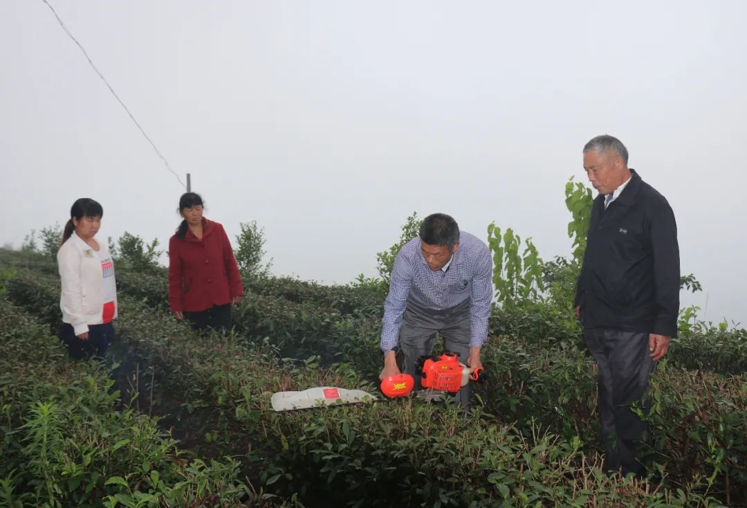 全国人大代表、安徽省金寨县四季春茶叶专业合作社理事长、党支部书记陈先志(右二)在给村民讲解茶叶种植技术。(陈先志供图)