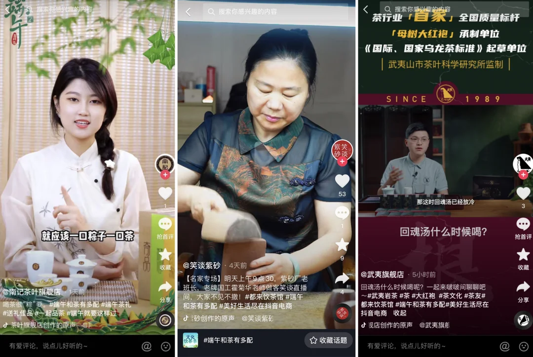 如今,随着消费者需求与注意力发生变化,茶叶等深耕传统的品类营销,也逐渐向互动性、沟通性方向靠拢。为适应这一趋势,「文化饮茶季」活动通过随心推券奖励,激励#都来饮茶馆 、#端午和茶有多配 、#美好生活尽在抖音电商 多个话题下商家参与热情。活动期间,#都来饮茶馆 话题已突破1.6亿;「全民挑战,饮茶一杯」、「直播对决,好茶PK」等玩法,则利用短视频挑战赛、直播挑战盘活了参与度,勾连起中腰尾部商家,让商家与品牌拥有更多主动表达的意愿和空间。